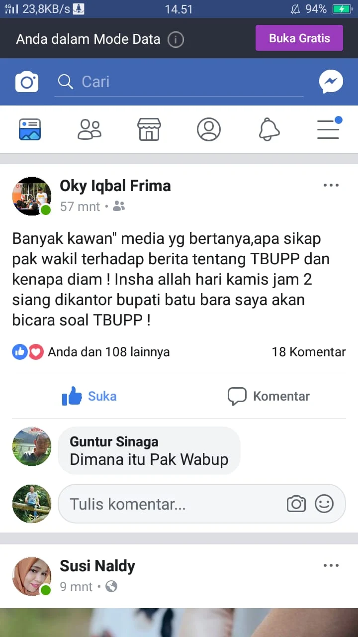 Pernyataan Wabup Batubara tersebut dalam waktu kurang dari 1 jam telah mendapat 108 like dan 18 komentar.