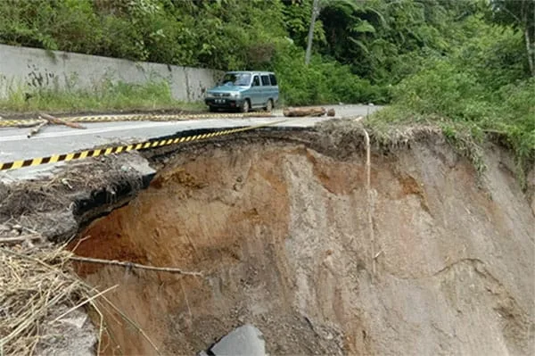 | Kondisi jalan umum yang longsor dan terancam gak bisa dilalui kendaraan yang menghubungkan Kabupaten Deli Serdang dengan Simalungun. |