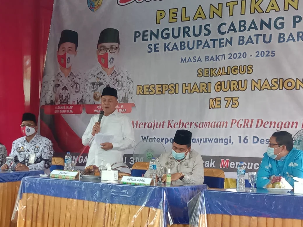 Bupati Batu Bara menghadiri pelantikan pengurus PGRI Sekabupaten Batu Bara bertempat di Banyuwangi Kelurahan Limapuluh Kecamatan Limapuluh Kota Mabupaten Batu Bara, Rabu (16/12/2020).