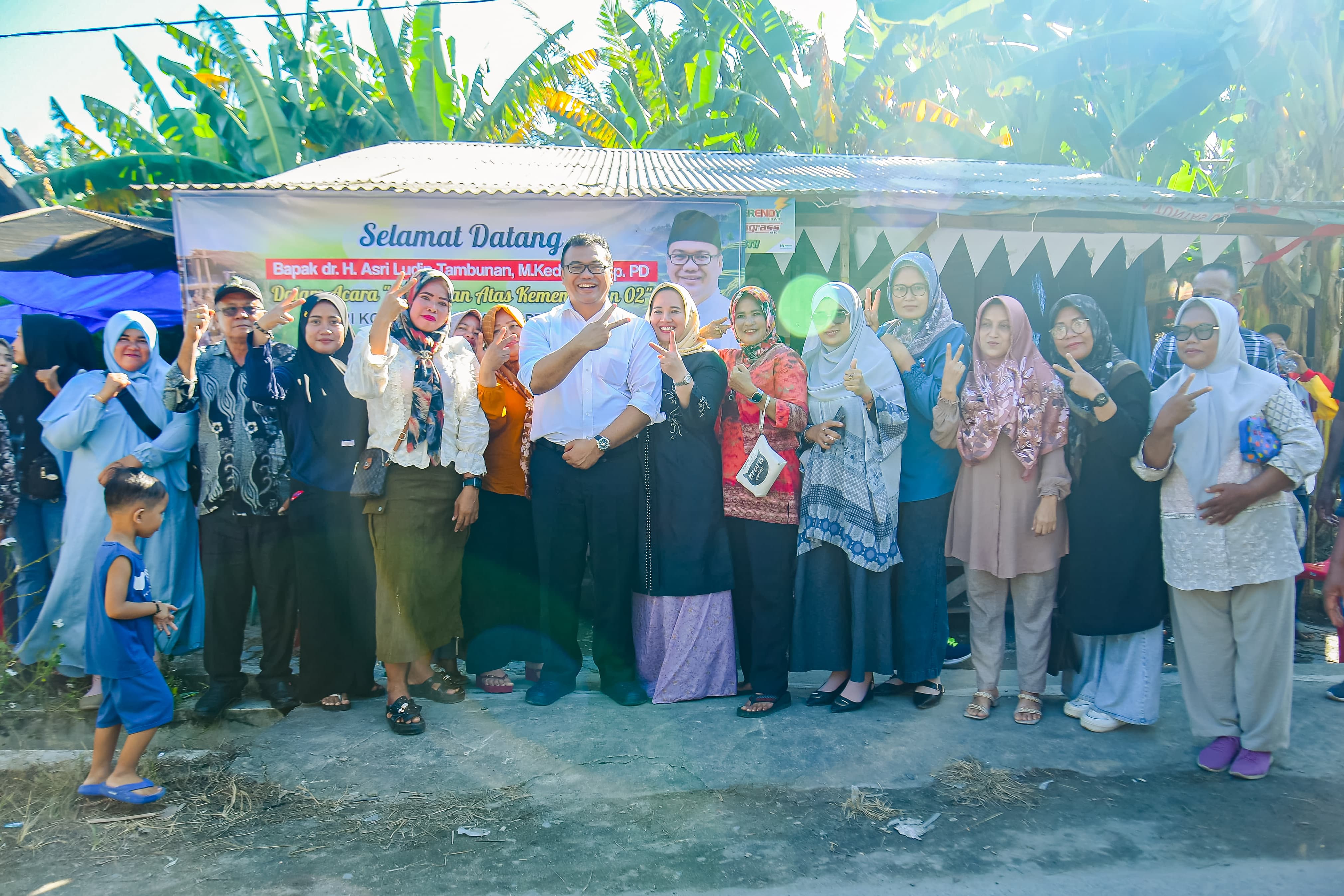 Bupati Deliserdang terpilih, Asri Ludin Tambunan bersama istri menghadiri acara Syukuran Kemenangan 02 yang digelar oleh Komunitas Petani dan Peternak di Warung Aspirasi Jumahir, Pasar Lalang Dusun II, Desa Pematang Johar, Labuhan Deli, Minggu (8/12).